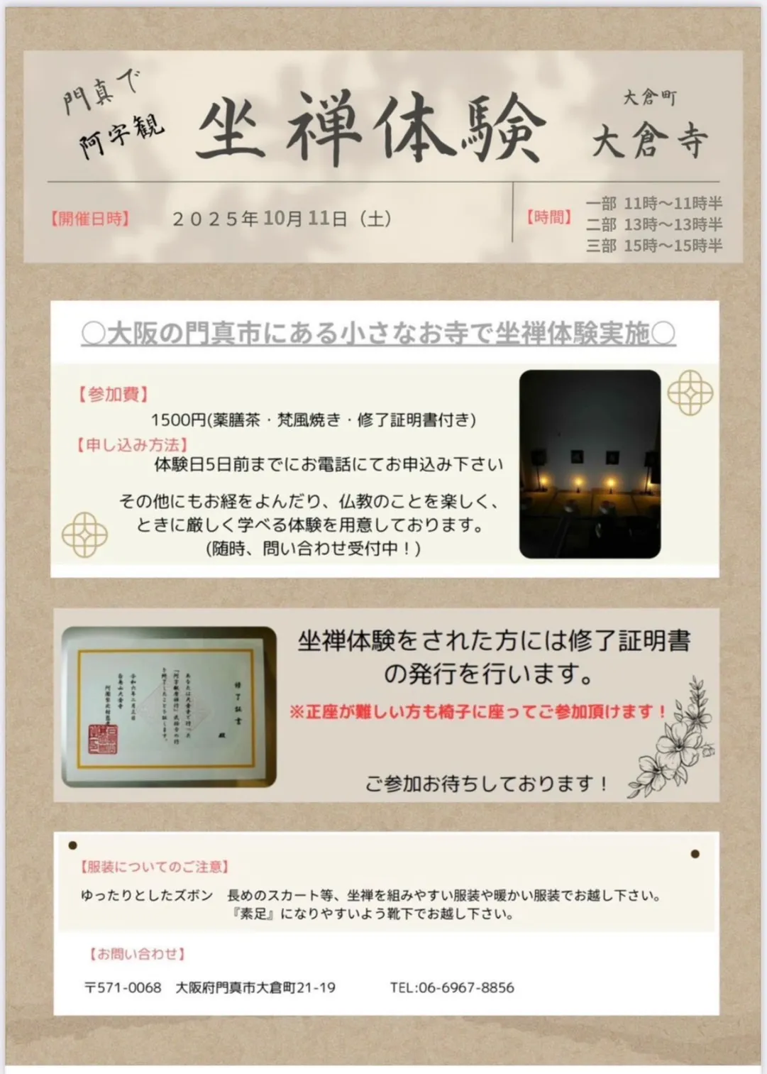 この度、小さなお寺「大倉寺」にて、座禅体験会を開催することになりました。 日々忙しく過ごされている皆様に、静かな環境でご自身の心と向き合う時間を提供します。