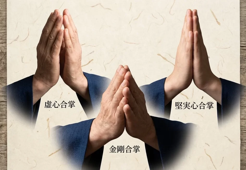 | 堅実心合掌 | 両手の指先をぴったりと隙間なく合わせます。 | 素直で偽りのない真剣な祈りの心。強い信心の表れ。 |