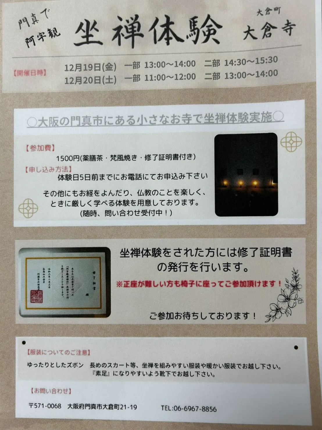 【白島山大倉寺】座禅会12月(阿字観)体験のお知らせ